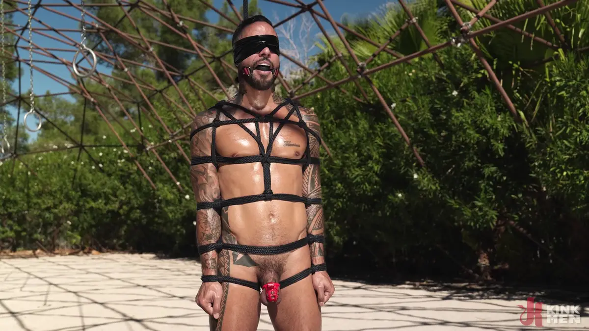 This BDSM scene starts with a general view of the place where Jona Ortiz is tied up. It appears that this is an old greenhouse, from which only the metal structure remains, and fields can be seen surrounding it. Jona is tied up in the middle, with thick ropes crisscrossed over his muscular, tattooed body. His cock is caged, his balls have leather straps, and a metal hook is inserted into his ass. A uniquely cool sight!
