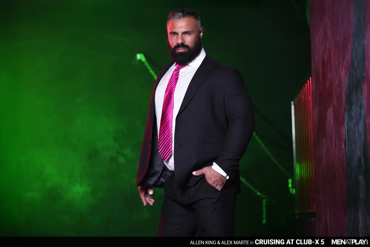 Alex Marte was the first to notice him – the first, and the only one with the nerve to approach. The Italian bear was barely contained beneath a black leather vest that billowed open, revealing a tantalizing glimpse of his own leather attire beneath. As he crossed the room, Alex’s eyes never left Allen – watching, evaluating, already mapping out the possibilities.